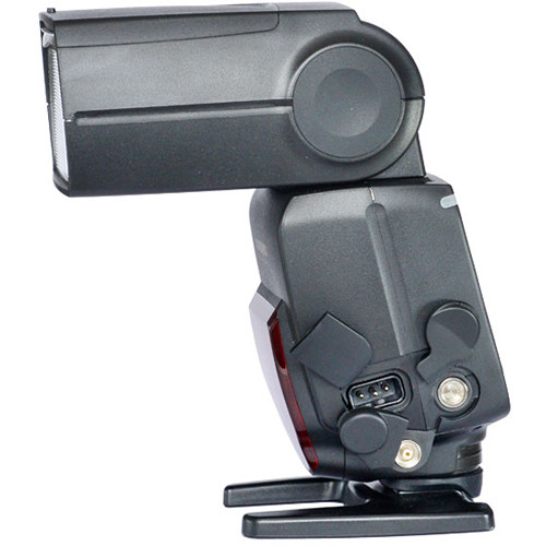 Operation is simplified with a clear LCD screen on the back, a dial, and a selection of buttons. The head also offers a pull-out bounce panel for reflecting some light forward when using the tilt functionality. Full sync options are available as well, with high-speed, 1st & 2nd curtain sync. It runs conveniently on 4 AA batteries, has a recycle time of three seconds at full power, and includes an HV power port for battery packs. Additionally, it has a PC sync port.